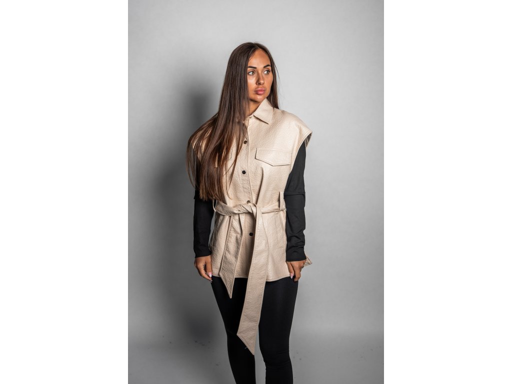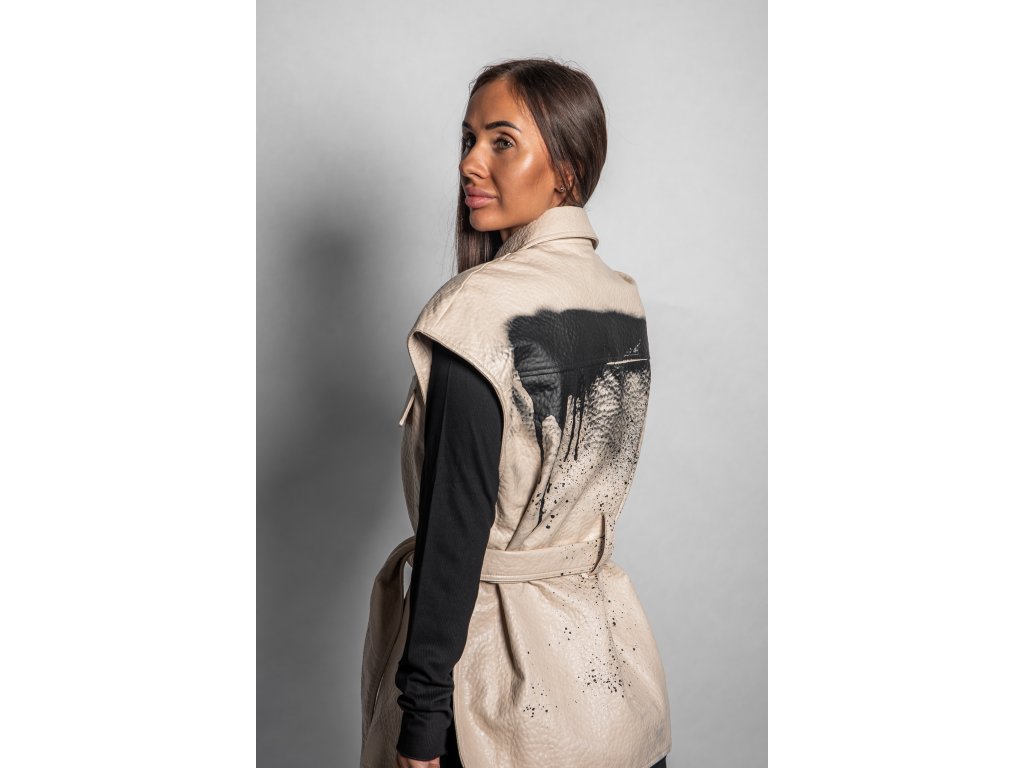 Limitovaná béžová kožená vesta s ruční malbou Black Drip. Každý kus je originál.