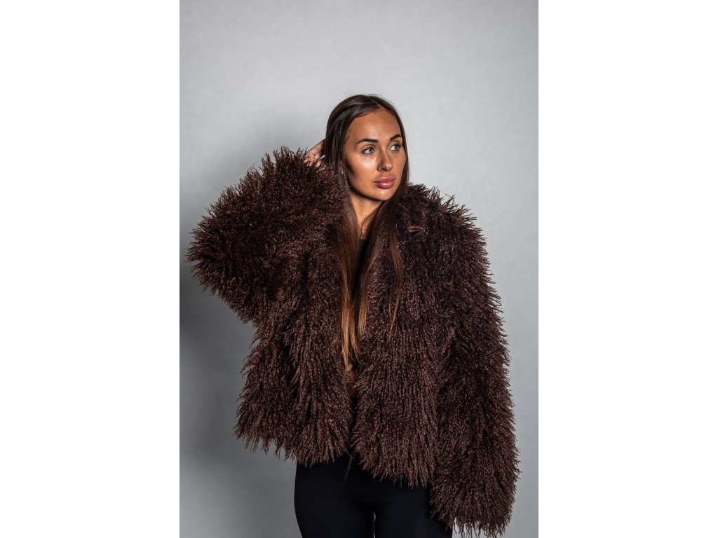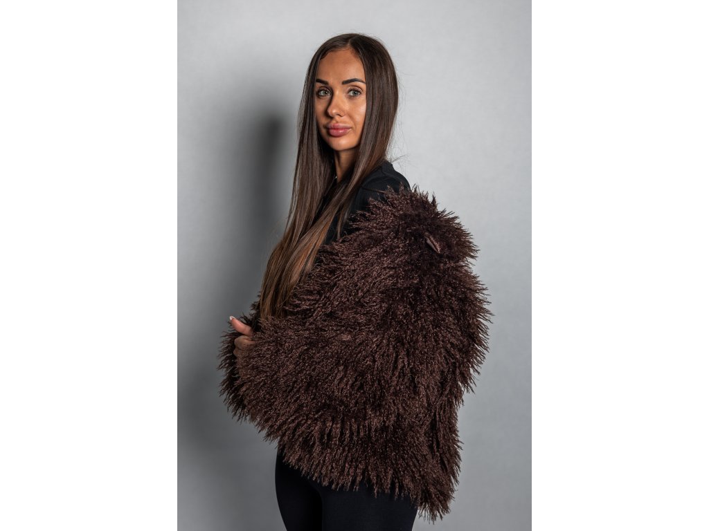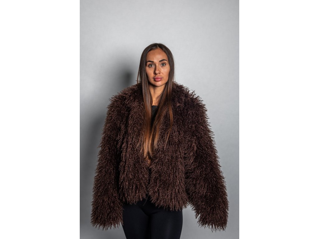 Dámský tmavě hnědý faux fur kabátek – hřejivý, stylový a luxusní vzhled pro chladné dny.